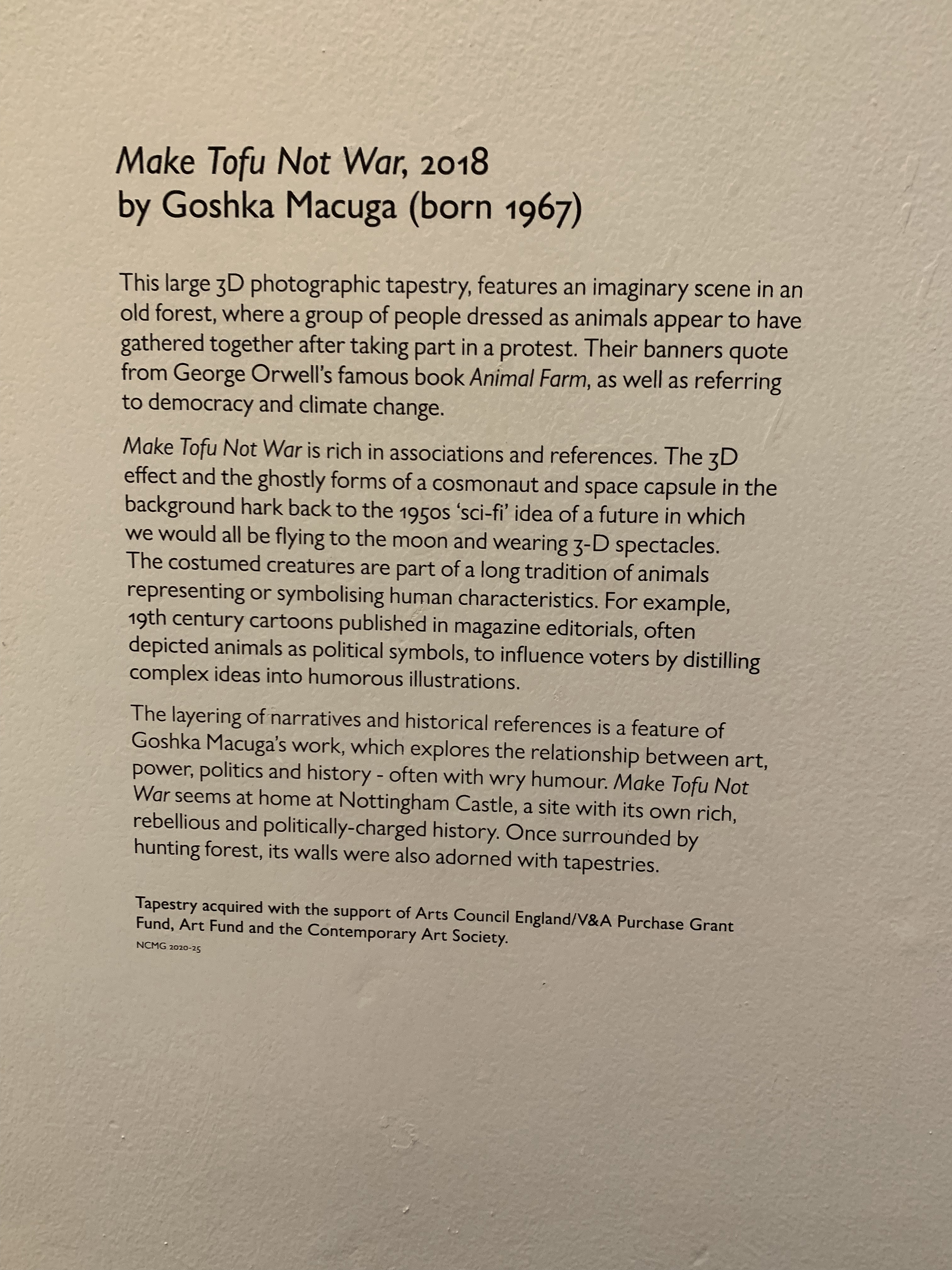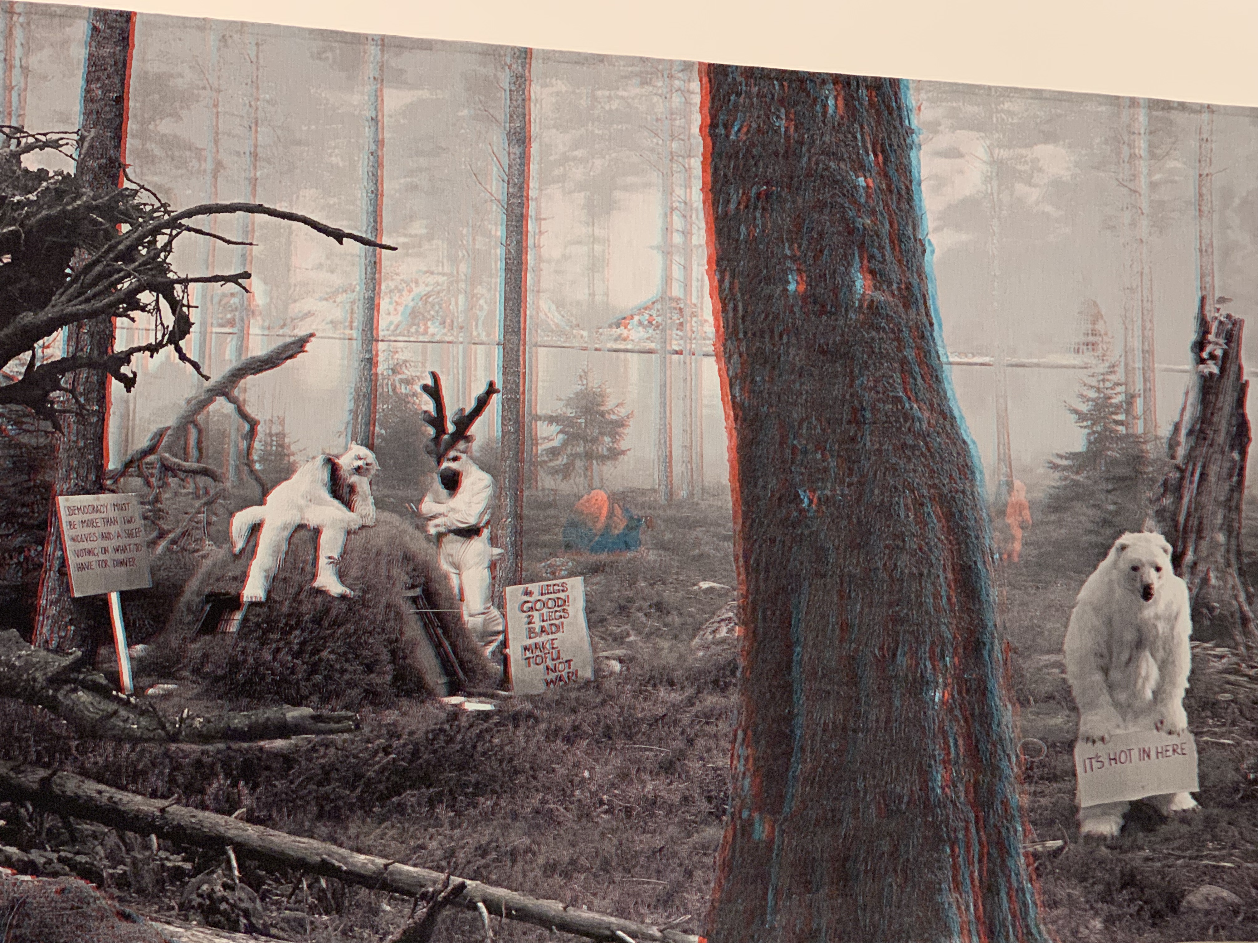 I was particularly struck by Goshka Macuga’s Make Tofu Not War art piece, which hits on some of my most deeply held spheres of belief and activism. Climate change, veganism, social injustice and the like. Would you believe it’s not a photograph with a 3D filter, but actually a woven tapestry? Incredible.